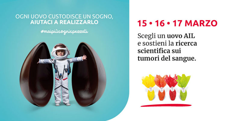 Per continuare a far crescere la Ricerca abbiamo bisogno del tuo aiuto: il 15, 16 e 17 marzo scegliendo le Uova di Pasqua AIL con un contributo minimo di 13 euro ci aiuterai a sostenere la lotta contro leucemie, linfomi e mieloma e a portare aiuto a tanti pazienti. Se oggi il 70% dei malati affetti da un tumore del sangue guarisce o cronicizza la malattia, è grazie ai 55 anni di lavoro di AIL e al tuo sostegno.