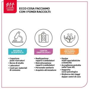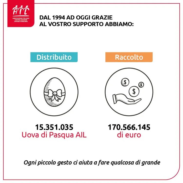 Per continuare a far crescere la Ricerca abbiamo bisogno del tuo aiuto: il 15, 16 e 17 marzo scegliendo le Uova di Pasqua AIL con un contributo minimo di 13 euro ci aiuterai a sostenere la lotta contro leucemie, linfomi e mieloma e a portare aiuto a tanti pazienti. Se oggi il 70% dei malati affetti da un tumore del sangue guarisce o cronicizza la malattia, è grazie ai 55 anni di lavoro di AIL e al tuo sostegno.